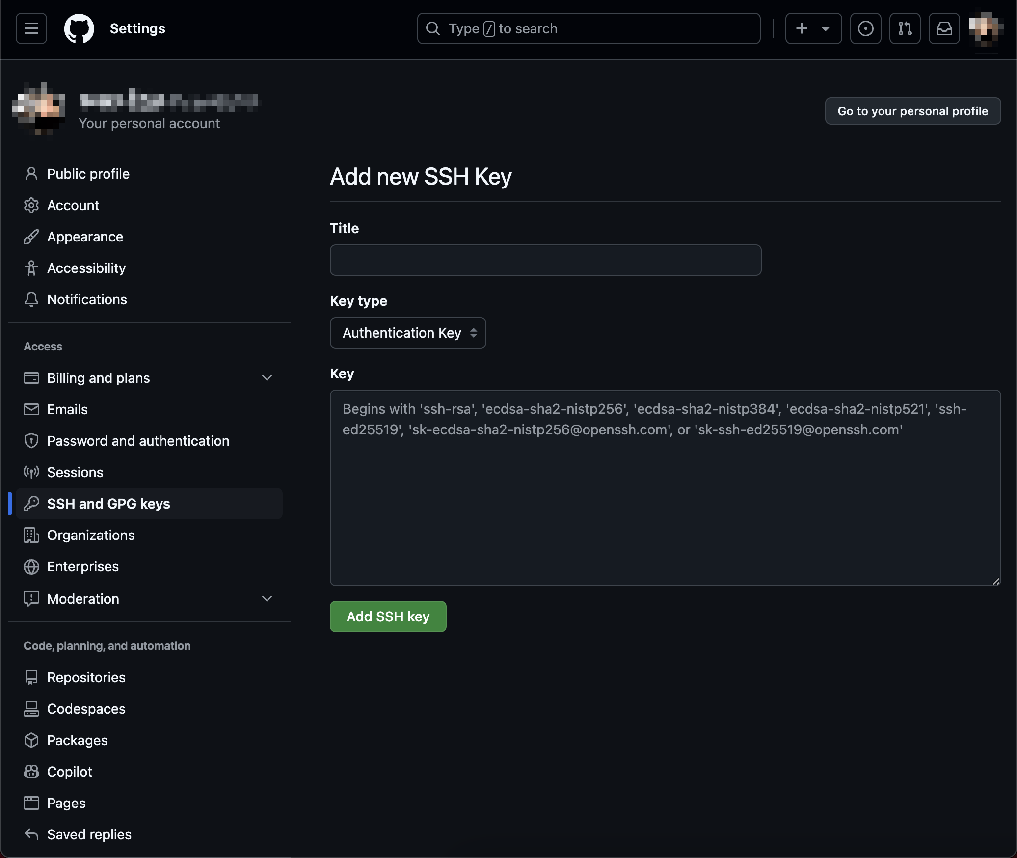 接着我们打开GitHub_Settings_keys 页面,新建New SSH Key,Title随意填,Key就把刚才复制的内容全都粘贴上去。然后点Add SSH Key即可。