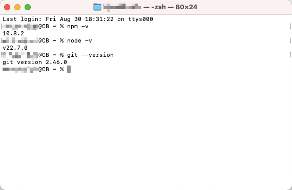 如出现npm、Node.js和Git的版本号,代表已经安装成功。
