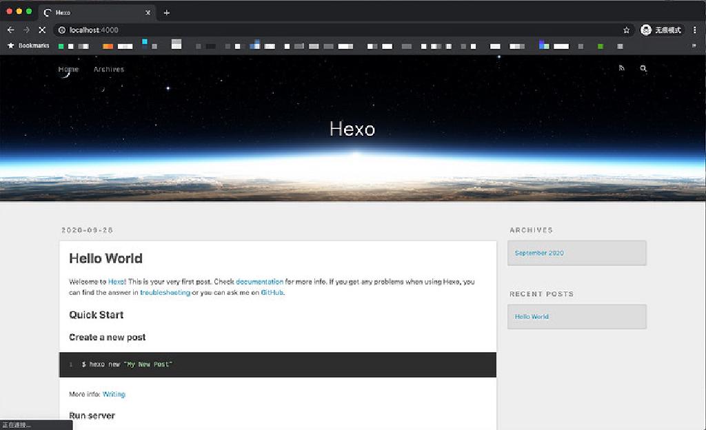在执行完hexo s后,通过浏览器访问http://localhost:4000即可预览你的博客,预览功能会实时监测博客的文件变化,并实时反馈在浏览器上,在发布之前用来调试前端非常好用。